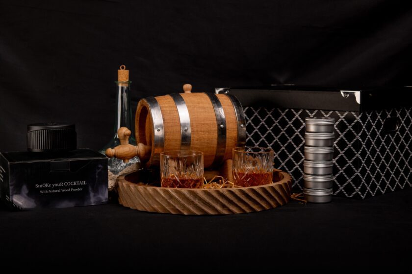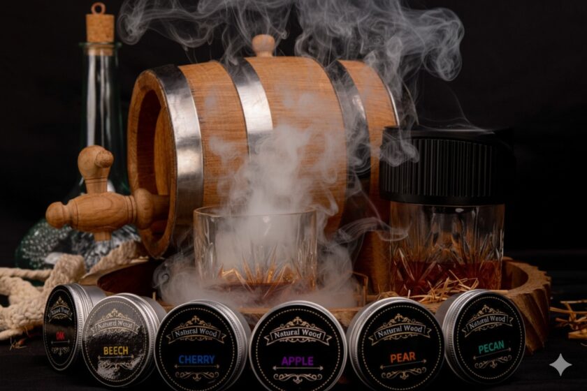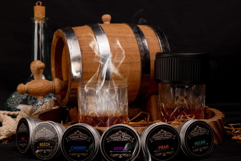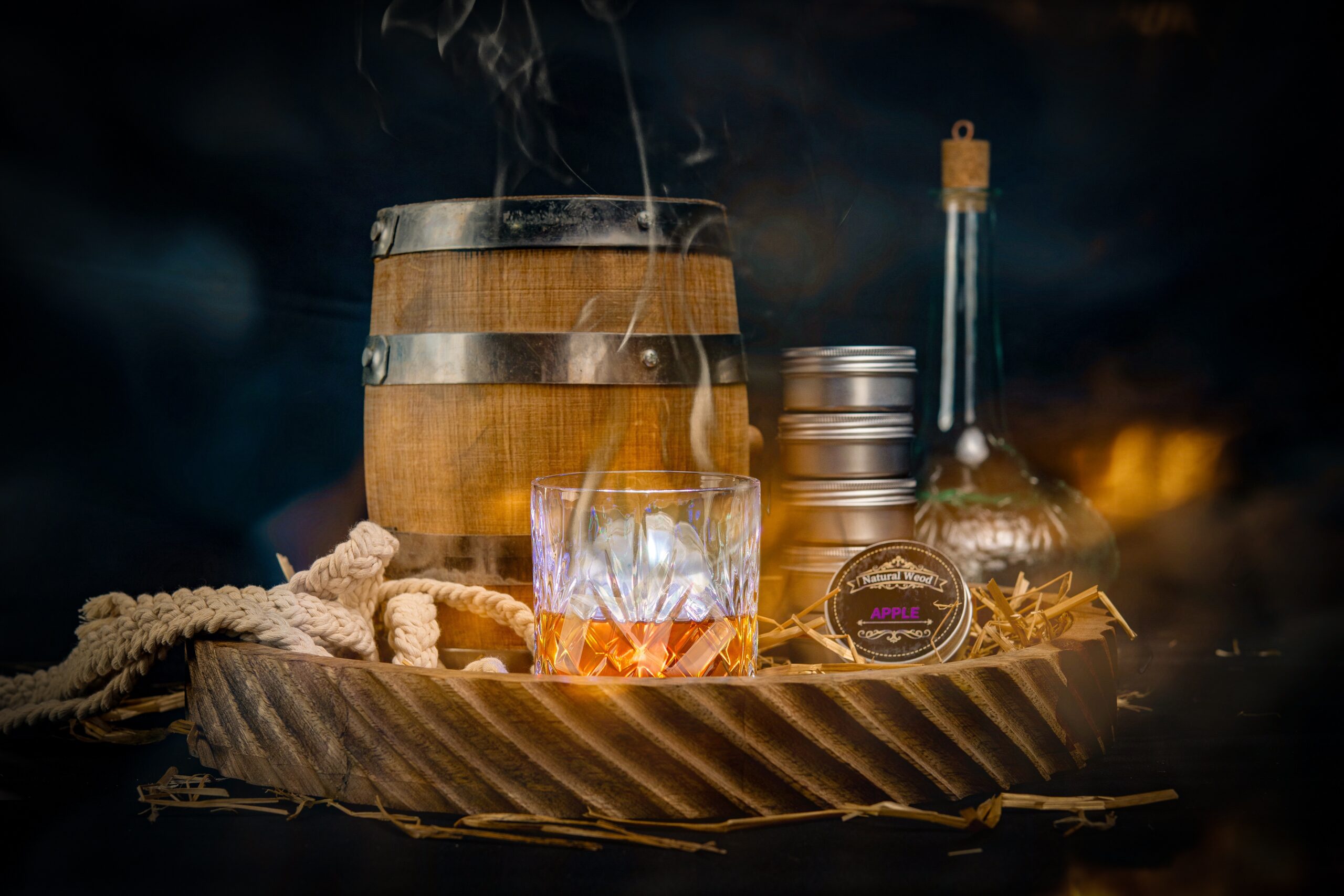 The kit includes Electronic whiskey smoker kit with 1 electric fumigator, 6 small metal boxes of wooden chips different flavors ( pear, pecan, oak , beech, apple)